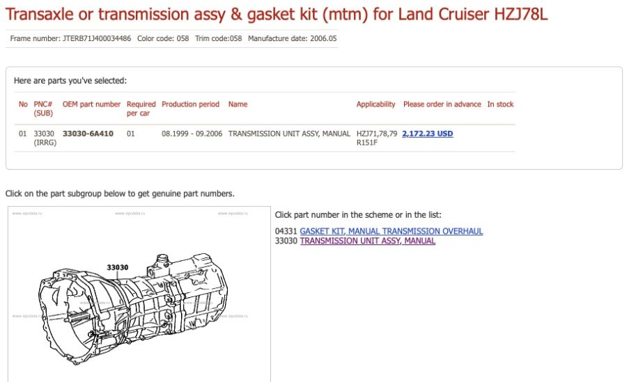 I'm selling used but fully functional Toyota Land Cruiser HZJ 78 manual transmission / gearbox / gear box (04.2007). Removed from a car with 300000 km. Price 780 euro.